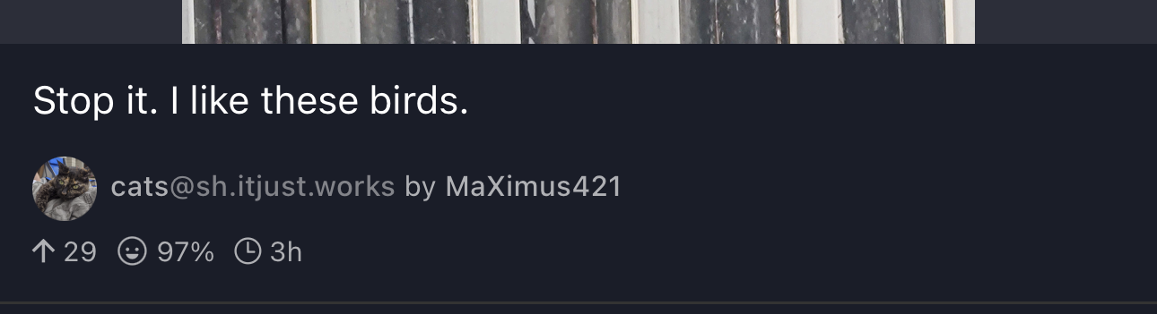 arrow-up173arrow-down1imageStop it. I like these birds.lemmy.worldMaXimus421@lemmy.world to cats@sh.itjust.works · 25 days agomessage-square3linkfedilink